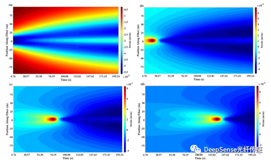 图9光纤与井筒不同距离处的应变瀑布图:(a) 2米,(b) 14米,(c) 26米,(d) 38米