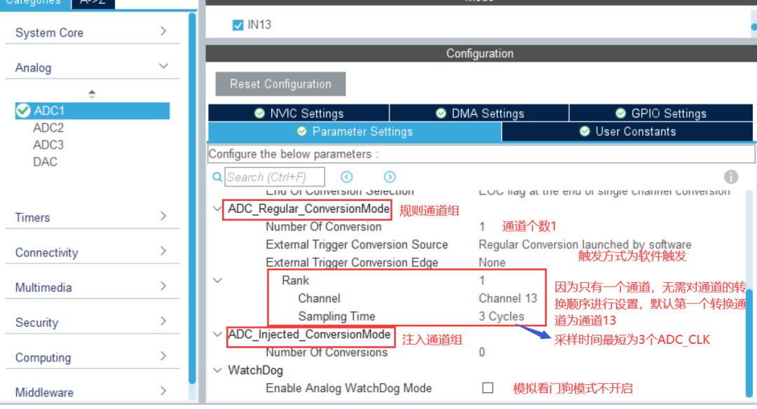 配置PC3位ADC1的通道13,配置内部温度传感器通道