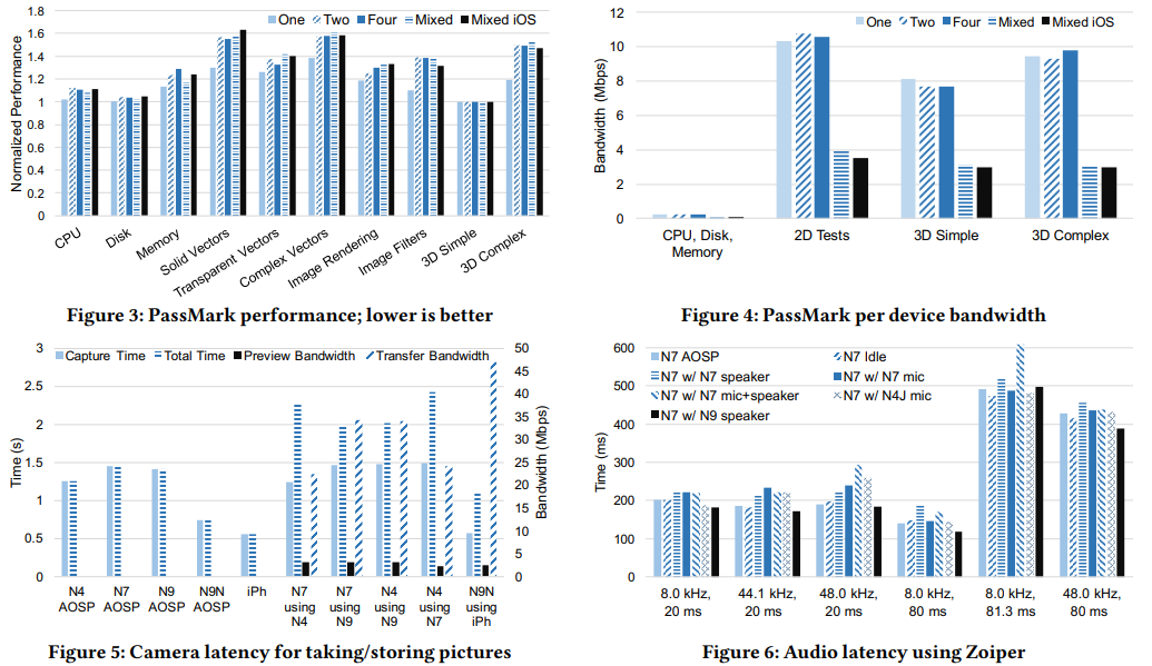 捕获时间表明,与使用本地摄像机相比,M2 产生的额外延迟可以忽略不计。远程摄像机场景的总时间要高得多,因为通过网络将图片传输到客户端应用程序的默认本地存储需要时间。在 N7 使用 N4 远程摄像头的最坏情况下,由于传输时间的原因,总时间比捕获时间多近一秒。图 5 还显示了拍摄照片的带宽要求,包括相机预览和从远程相机拍摄的照片到本地存储的传输中。相机预览的分辨率低于原始显示分辨率,因此其带宽要求低于 3Mbps。