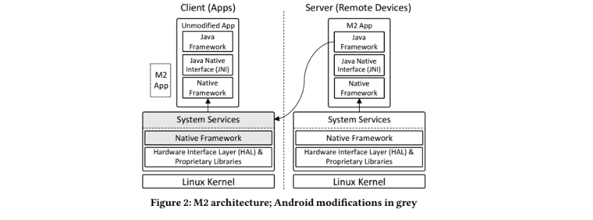 M2提出以数据为中心的共享方式,将移动设备分为client和server,分别在client和server建立可用设备清单和设备清单。M2通过修改移动系统的System ServICe层实现跨设备的资源共享,因为上层应用是通过系统服务(publIC API)获取的数据。