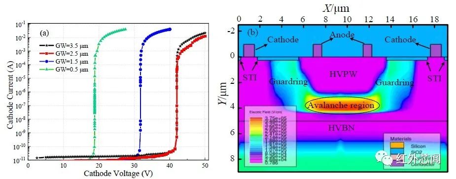 基于0.18 μm BCD工艺对所提出的SPAD器件使用SILVACO Atlas工具进行了盖革模式下的二维器件仿真。仿真采用了Shock-Read-Hall载流子产生-复合、Conmob和Fldmob迁移率、Selberherr碰撞电离和Geiger等物理模型以获得接近实际的器件电学特性。为了能使所设计的SPAD器件既满足小尺寸要求又保证不发生边缘击穿,需要优化最佳保护环间距。图2(a)显示了仿真得到的四种不同保护环间距的器件I-V特性曲线。可以看出,保护环间距为GRW=0.5 μm和GRW=1.5 μm器件的雪崩击穿电压分别为19 V和31.7 V,而保护环间距为GRW=2.5 μm与3.5 μm器件的雪崩击穿电压均为42 V,这说明当间距过小时,会在保护环边缘区域提前发生雪崩击穿,从而使SPAD器件不能正常工作。综合考虑器件尺寸及性能,本文选用2.5 μm的保护环间距。图2(b)为GRW=2.5 μm器件在过偏压为3 V下的二维电场分布情况。可以看到器件雪崩区中心距表面深度约为4 μm,雪崩区宽度约为1 μm,电场分布均匀、集中,电场强度峰值达到3.75×10⁵ V/cm,从而保证了对近红外光子有更高的探测概率。由于虚拟保护环区域掺杂浓度低,电场强度明显小于雪崩区中心电场,能够有效防止器件边缘过早击穿,同时避免STI界面缺陷产生的载流子被强电场驱入雪崩倍增区而引发严重的暗计数噪声。