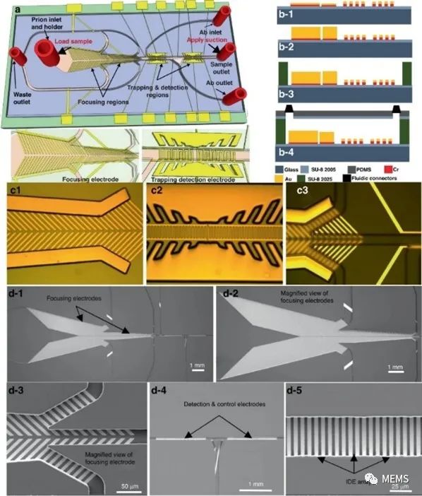 该MEMS微流控生物传感器的设计包括三种新颖的区域/功能,如图1a所示。