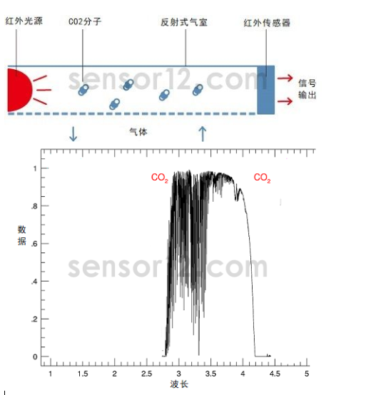 3. 吸收部分光谱:二氧化碳分子吸收特定波长的红外光,吸收的量与环境中的二氧化碳浓度成正比。