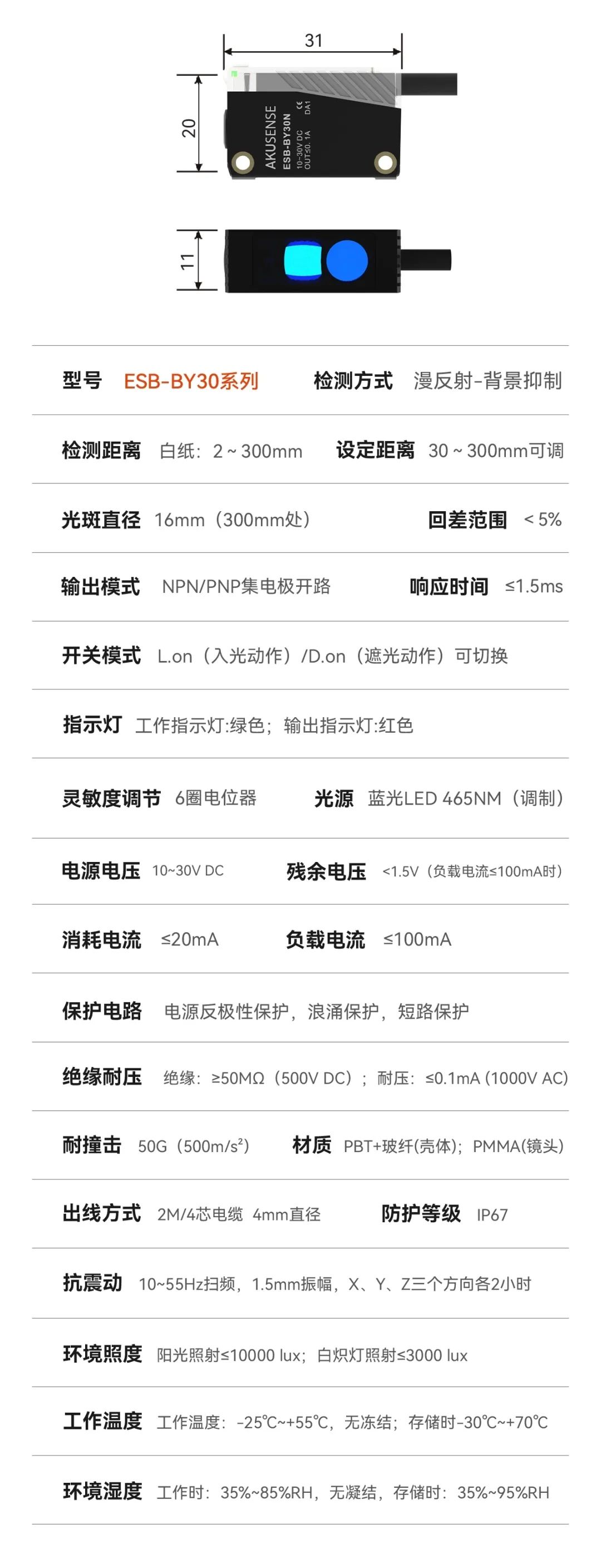1、选用明治蓝光漫反射光电传感器ESB-BY30N,465nm波长调制蓝光,短波长,高能量,蓝光光斑清晰可见