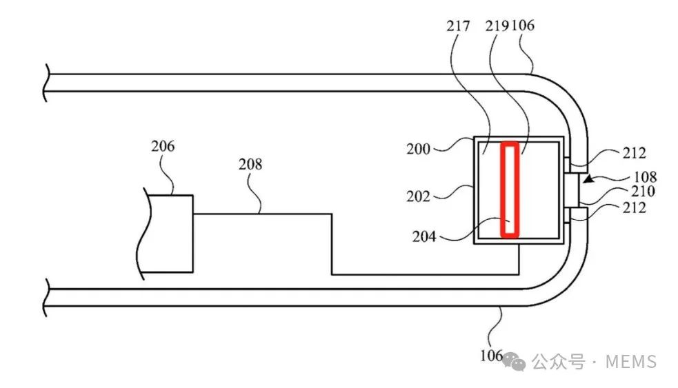 安装有圆柱形波纹状MEMS扬声器(红色框)的电子设备剖视图