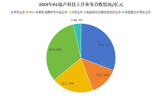 瑞声科技的业务包括声学业务、PSS—车载及消费声学产品业务、光学业务、电磁传动及精密结构件业务、传感器及半导体业务。从今年上半年的营收情况来看,电磁传动及精密结构件业务是其营收大头,贡献了33%的营收;其次是声学业务,营收占比为31%。光学业务和PSS的营收占比分别为20%、13%。