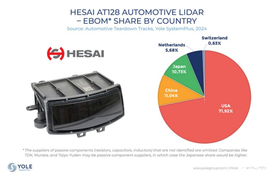 大部分组件由美国供应(占 72%),主要归功于 Lumentum 和德州仪器。中国紧随其后,占 11%,主要归功于禾赛的 20 款 ASIC。在成本分摊方面,赛灵思单一组件处理器的成本分摊率(占 33%)领先,而禾赛占系统所用 ASIC 的 21%。
