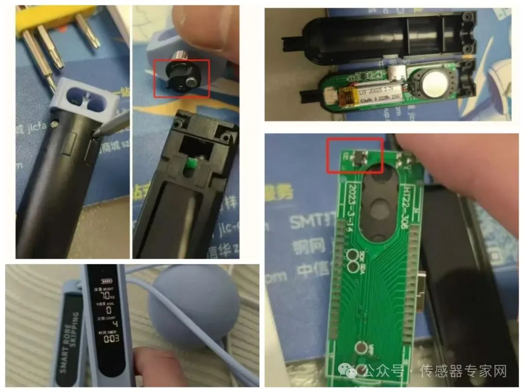 面包板社区拆解了一个智能跳绳,在跳绳转动端有一个磁铁(下图左上红框处),随着跳绳转动而运动,而在下边手柄处的电路板临近位置,有一颗同样是SOT23-3封装的霍尔传感器(下图右下角红框处),当磁铁转动一圈靠近霍尔传感器,就可以计数一圈。