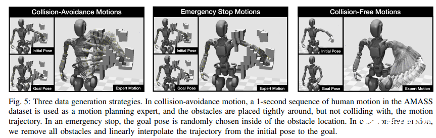 研究团队将这些人类动作轨迹重定向到机器人的关节配置上,并在轨迹周围生成紧凑的障碍物,确保轨迹本身不发生碰撞。 训练数据的生成采用了三种策略:避障运动、紧急停止和无碰撞运动。