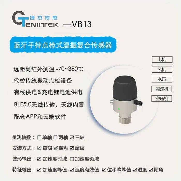 2)1机3用手持式蓝牙远距离测温与测振复合传感器VB13,此产品是一款小型的多功能蓝牙无线传感器,具备振动、倾角和远距离红外测温(-70~380℃)等检测功能,尺寸小巧、一次充电正常使用30天以上,适用于技术工人和工程检修人员随身携带,对设备进行点巡检。