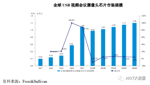 受外部环境变化影响,在线会议在全球成为主要趋势,推动全球视频会议市场规模持续增长。根据Frost&Sullivan数据,全球视频会议市场规模在2021年达到89亿美元,预计整体市场规模将在2026年达到192亿美元,年复合增长率为16.6%。根据Frost&Sullivan数据,2021年全球USB视频会议摄像头芯片市场规模为1.09亿美元,2017-2021年复合增长率为52.8%。未来预计USB视频会议摄像头芯片市场规模逐渐饱和,2026年市场规模约为1.20亿美元。