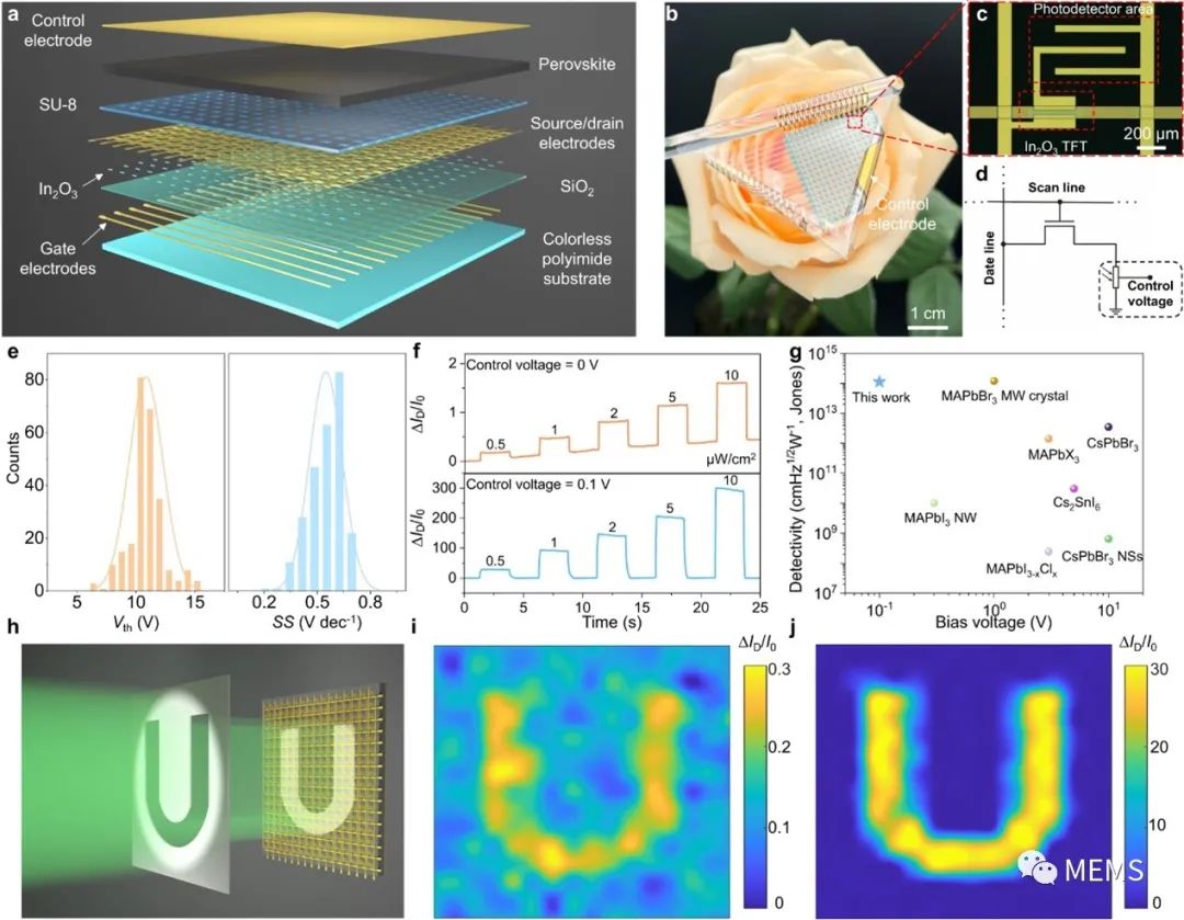 将基于金属卤化物钙钛矿的带有控制电极的光电探测器与基于16 × 16薄膜晶体管(TFT)的柔性有源矩阵背板单片集成,证实其能在弱光环境下实现高对比度成像(如图5)。