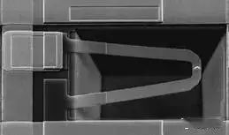 实物FBAR扫描电镜图。故意将其设计成不平行多边形是为了避免水平方向水平方向反射导致的谐振,如果水平方向有谐振则会形成杂波。