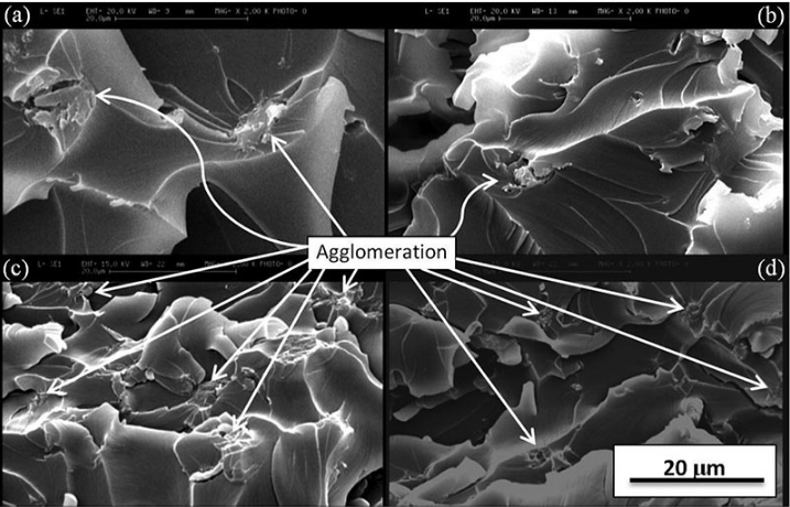 团聚是许多石墨烯聚合物复合材料中的一个问题。团聚是由范德华力引起的,导致石墨烯颗粒被吸引到其石墨烯颗粒上。团聚会导致石墨烯结块并阻碍均匀分散。聚合物复合材料中填充材料的团聚通常会导致与主体的界面相互作用减少。复合材料中较低程度的界面相互作用最终会降低石墨烯改善复合材料性能的有效性。这通常会导致机械性能低于预期,而团聚是当今纳米复合材料领域面临的最大挑战。从机械性能的角度来看,团聚也会导致团聚石墨烯团块之间出现薄弱点。