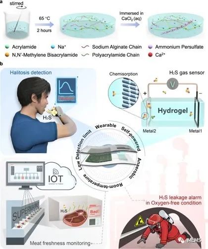 据麦姆斯咨询报道,近期,来自中山大学和天津理工大学的研究人员合作开发了基于原电池结构的低成本、柔性自供电传感装置,以用于各种应用场景下硫化氢生物标志物的分析。该传感装置的传感机制归因于气体分子在电极表面的化学吸附所引起的电极电位的变化。固有可拉伸的有机水凝胶被用作固态电解质,以使传感装置在拉伸变形或各种环境下稳定和长期工作。该研究最终开发出的开路传感装置具有高灵敏度、低检测限(LOD)和对硫化氢的优异选择性。相关研究成果以“Design of stretchable and self-powered sensing devICe for portable and remote trace biomarkers detection”为题发表在Nature CommunICations期刊上。