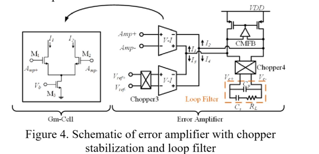 斩波幅度信号馈入误差放大器,其原理图如图4所示。其输入级是一个gm单元,将输入电压转换为电流。通过将两个gm单元的输出连接在一起,在电流域中完成振荡幅度和参考电压的比较。在斩波器4流到环路滤波器之前,误差电流被斩波器4变频到DC范围。