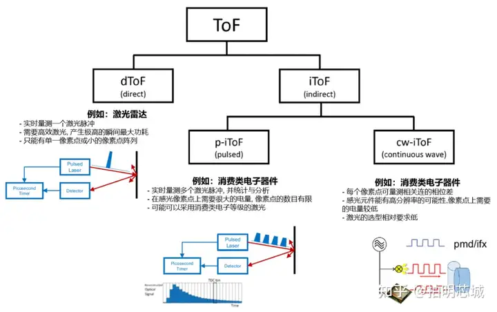 ToF传感器按技术原理可分为光源被脉冲调制(Pulsed Modulation)(dToF)或连续波调制(Continuous Wave Modulation)(iToF)。dToF技术在激光功耗、抗干扰、远距离精度等方面有着明显优势,是远距离应用的绝佳候选,但对芯片设计、系统设计、制造工艺要求较高。iToF在芯片工艺和产业链已趋于成熟,但效果并不完美,其精度会受测量距离影响,距离限制在5米以内,从而导致其应用体验不佳。