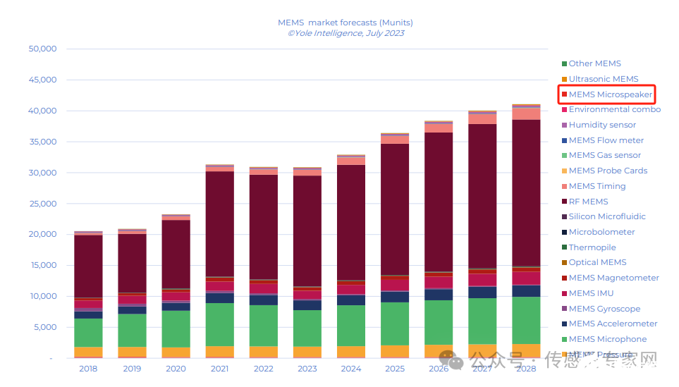 据知名产业研究机构Yole此前发布的《MEMS产业现状2023》报告预测,全球MEMS微型扬声器2022-2028年复合年均增长率(CAGR)高达180%,是未来6年增长最快速的MEMS细分领域,而全部MEMS器件的CAGR为5%。