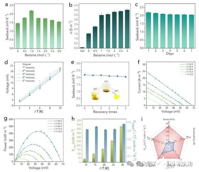 Figure 4. (a) The effect of betaine concentration on the Se. (b) The effect of betaine concentration on the ionic conductivity. (c) The Se change during the rest in air for 7 days. (d)The fitted plots of voltage-temperature difference for different recovery cycles. (e) The measured Se values after different recovery cycles. Insets show the recovery cycle. (f) Current density-voltage plots under different ∆Ts. (g) Power density-voltage plots under different ∆Ts. (h) The calculated maximum specific output power density. (i) Comprehensive comparisons between the GB-HCF based TECs and conventional gelatin-based TECs in terms of Pmax/∆T2, Se, σ, tensile strength, and stretchability.