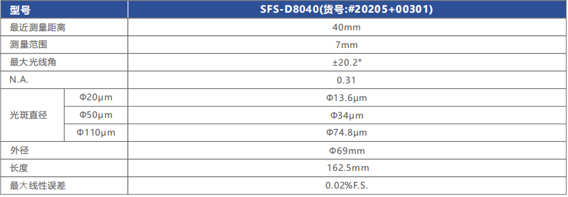 - 最大线性误差:±1.4μm。这一极低的误差值体现了SFS-D8040在测量精度上的很好表现,即便是对微米级精度的要求,也能轻松应对。
