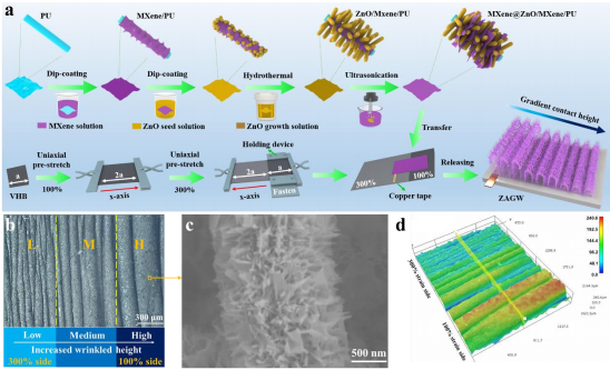 本工作提出的电纺聚氨酯基压阻传感器由具有MXene嵌入ZnO纳米线阵列的高度梯度褶皱聚氨酯电纺膜(ZAGW)组成(图2a),ZAGW的制备过程如下:通过电纺技术制备聚氨酯电纺膜;将聚氨酯电纺膜依次在MXene水溶液中浸涂、ZnO种子液中浸涂、ZnO生长液中水热以及MXene水溶液中超声,以在聚氨酯纤维表面生长ZnO纳米线阵列并在阵列的间隙中插入MXene(图2c);将经表面处理的聚氨酯电纺膜转移到经特殊预拉伸的VHB基体上,释放预应变以构筑高度梯度褶皱结构(图2b,d)。
